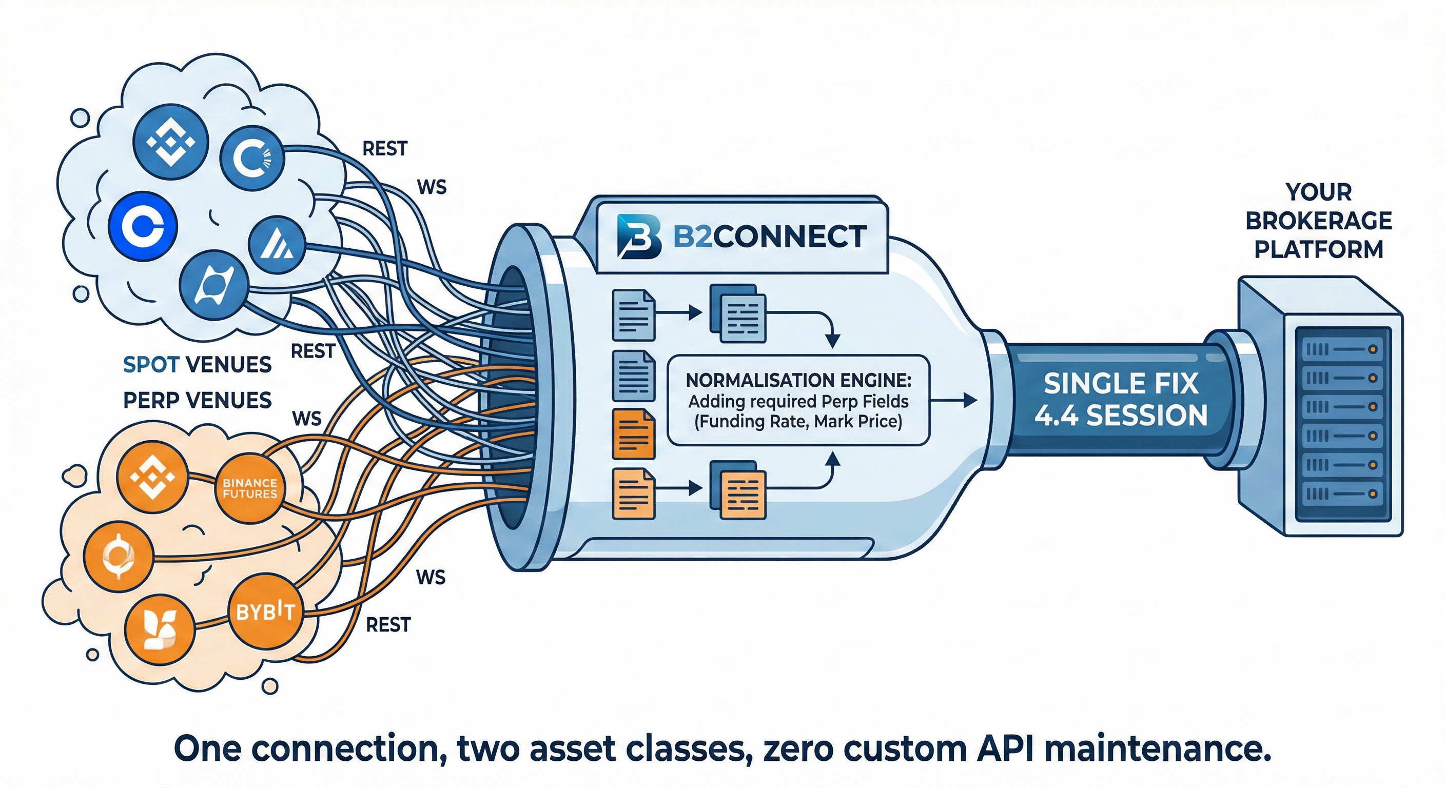 A brokerage owner's guide to the structural differences between spot and perpetual futures: pricing architecture, funding mechanics, margin risk, and what your connectivity layer needs to handle both.